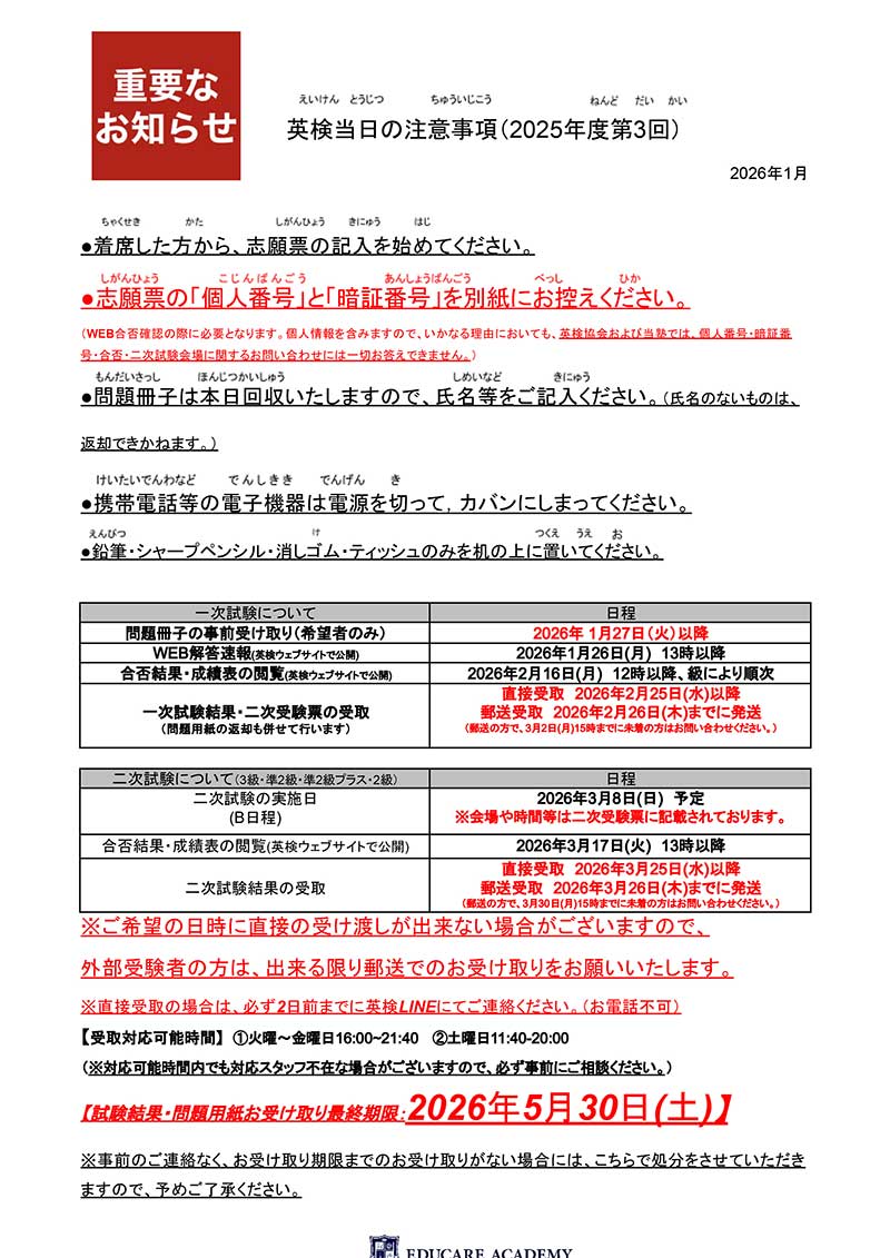 1月24日(土) 2025年度 第3回 英検受験される方への注意事項はこちら